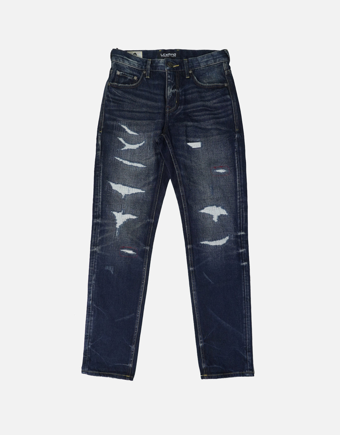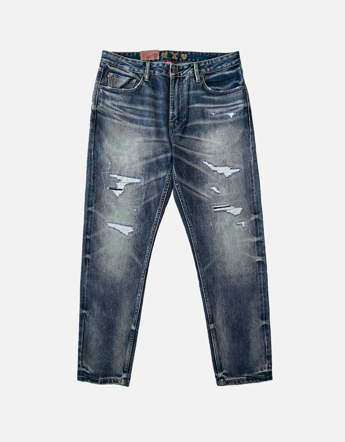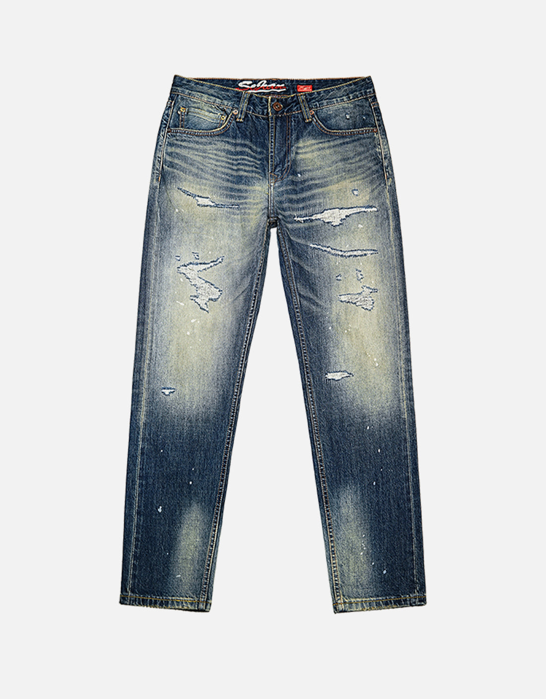 Destroyed Jeans Pants Light Distressed Wash Print Pattern Selvedge Denim