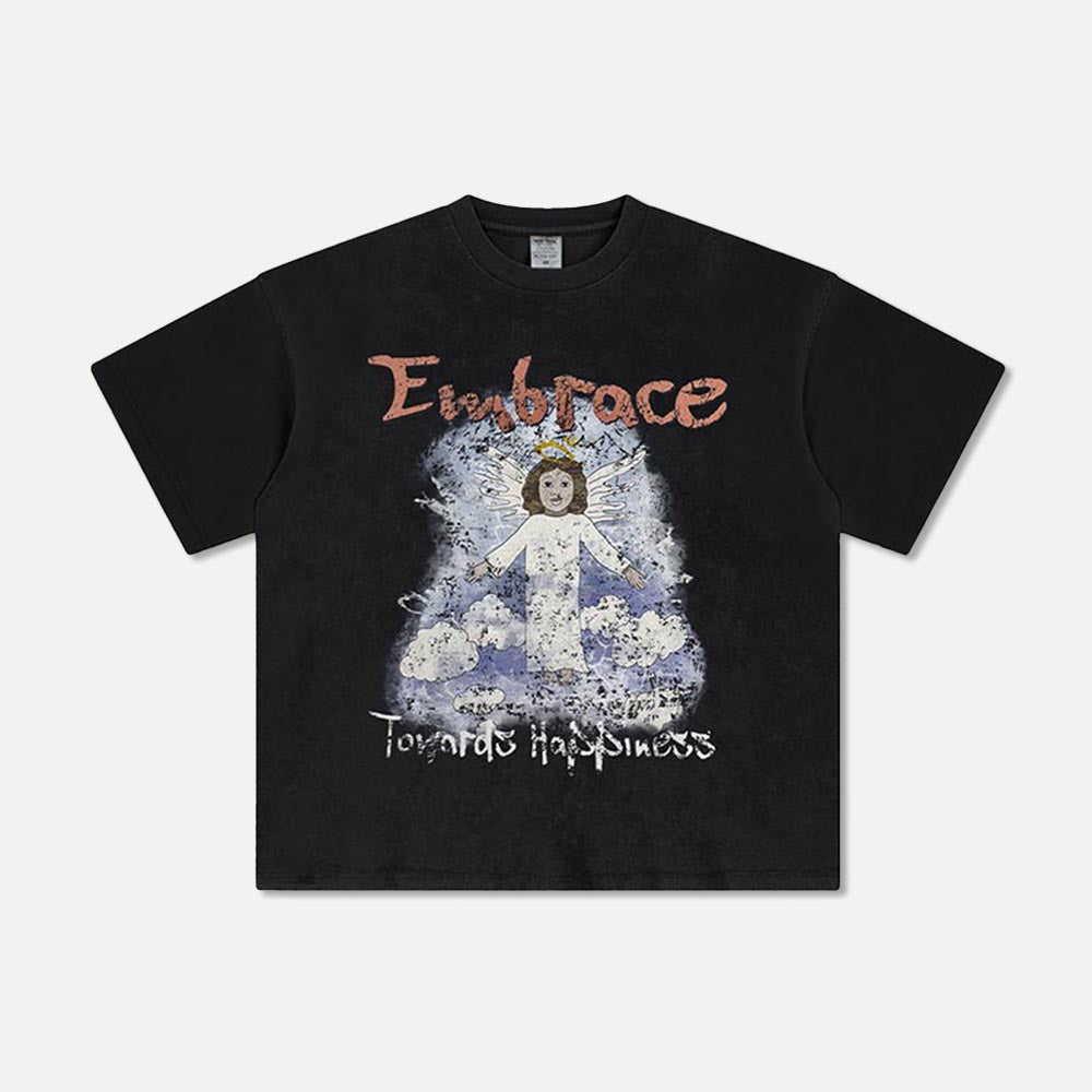 270G washed angel pattern print round neck vintage street loose short sleeve t-shirt