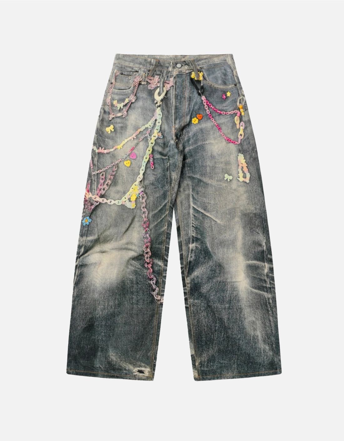 This pair of jeans uses 3D cold transfer printing technology to create a unique washed...