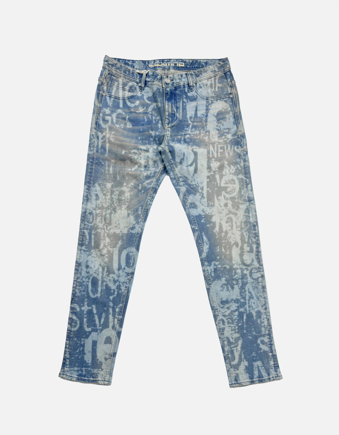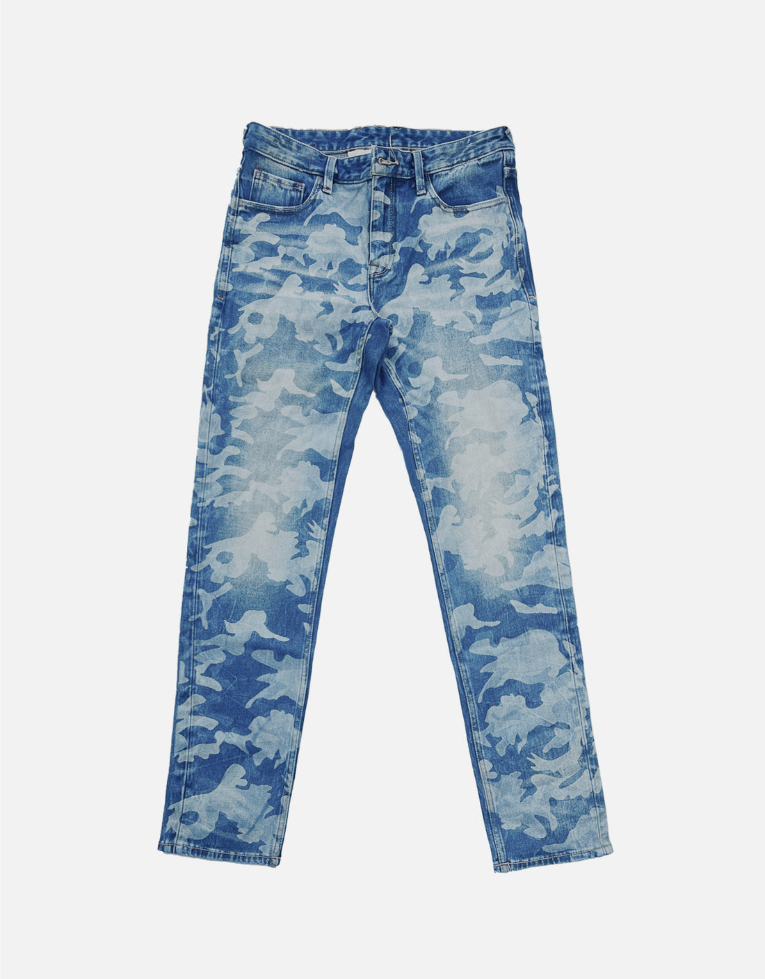 This is a pair of blue jeans featuring a laser - crafted pattern. The laser...