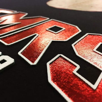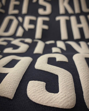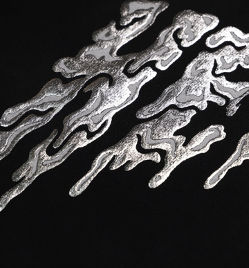 Chemically designed to puff up when cured these inks become raised when they reach the correct temperature. This process works really well with large and bold designs but also as a final accent colour in a multi layer print.