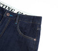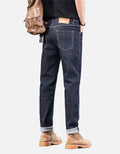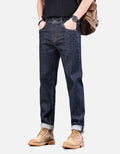 This men's jeans comes in dark blue, featuring a classic five - pocket style and a mid - rise design, with a button - and - zipper fly. The fit is slightly straight - leg. The fabric has a natural texture. The cuffs can be rolled up to reveal the light - colored inner lining, adding layers to the outfit. Paired with a black top and brown work boots, it has a simple yet casual workwear vibe, suitable for various daily occasions, showing a tough and casual men's temperament. The overall style is versatile and practical, easily matching different tops to create diverse looks.