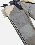 Based on 13.5 ounces of denim fabric, various hand-rubbed/three-dimensional whiskers/and various aging processes such as faded/washed effects and reshaping techniques using different spacing give a crisp hungry impression.
