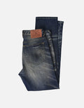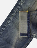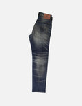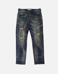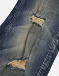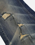 Distressed ripped jeans, crafted from classic blue denim. Washed to achieve a natural gradient hue. The pant legs are dotted with numerous rips, whiskers, and patch designs. The deliberately created worn - out traces embody the current popular retro - trend style, adding uninhibited individuality. The straight - leg fit suits various body shapes. Basic structures like the waistband and pockets are intact, retaining the tough texture of denim pieces.