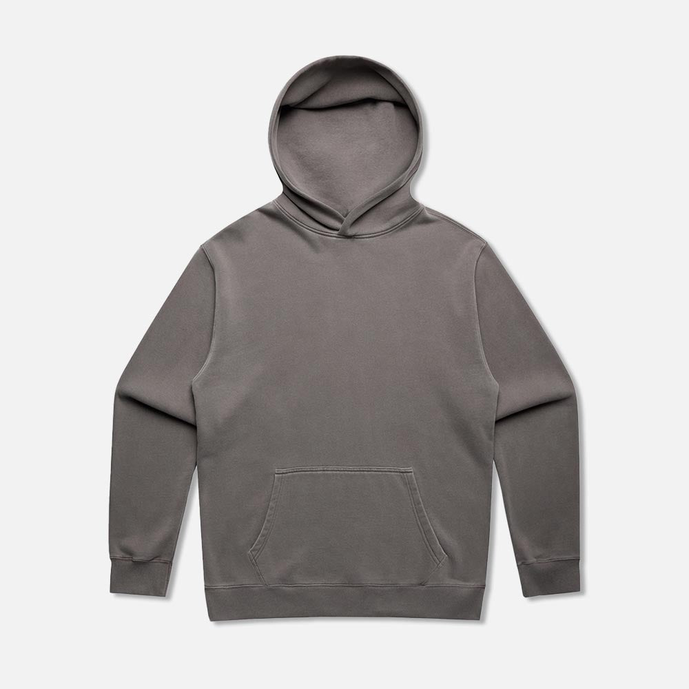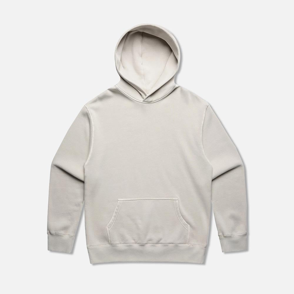 Pullover hood, drop shoulder, kangaroo pocket, self-fabric lined hood, no drawcord, garment dyed, sleeve cuff ribbing